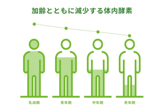 体内で作り出される酵素の量は限られているので、年齢を重ねるにつれて酵素は減少してしまいます。酵素が不足すると、生命維持に必要な栄養成分の消化吸収が不足してしまうので酵素を外部から食べ物として摂取する必要があります。