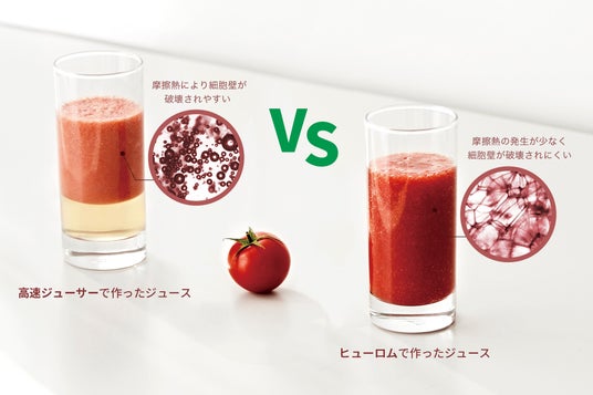 ヒューロムのスロージューサーは、食材にかかるストレスや熱を最小限に抑え、ゆっくり、しっかりと搾汁します。熱に弱い酵素やビタミンC等も壊さずに抽出でき、また空気の混入も少ないため食材の酸化も抑えることができます。