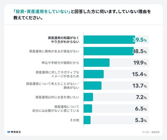 しかし、同調査の中で投資・資産運用をしていないと回答した方に「していない理由を教えてください。」と質問したところ、39.5%の人が「資産運用の知識がなくやり方がわからない」と回答し、投資・資産運用について手続きや情報面でのサポート不足により行動に移すことができない人がいることが分かりました。