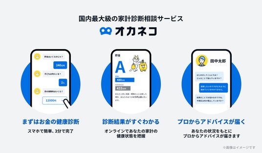 スマホから居住地や年齢、年収、家族構成などの質問に答えるだけで、同地域・同年代の人と比較し、ユーザーの家計状況を診断。その後、診断結果をもとにFP(ファイナンシャルプランナー)やIFA(金融商品仲介業者)等のお金のプロからアドバイスコメントが届き、ユーザーがチャットで気軽に相談することができるオンラインサービスです。