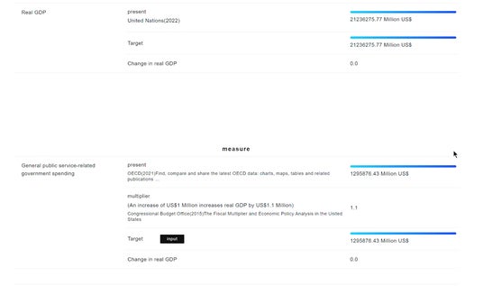 3.inputから各政策の数値を変更すると、乗数を用いて、目標への影響(名目GDPの向上度など)がわかります。