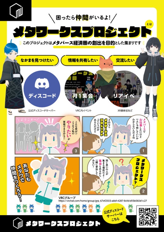 Meta Works Project(メタワークスプロジェクト)は、メタバース経済圏の創出を目的としたコミュニティです。具体的な活動としては、Discordサーバでの情報交換交流、月に一回の集会、リアルイベントへの出展などがあり、プラットフォームや属性の垣根無く様々な方が集まっています!