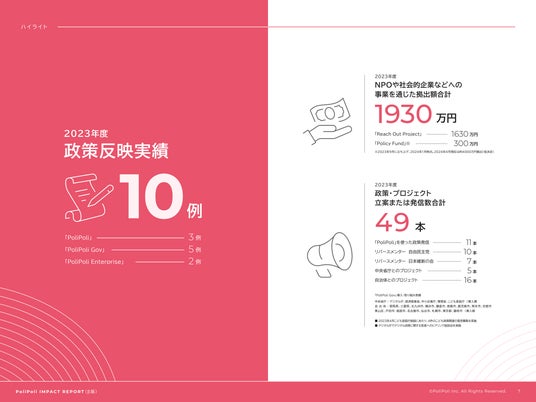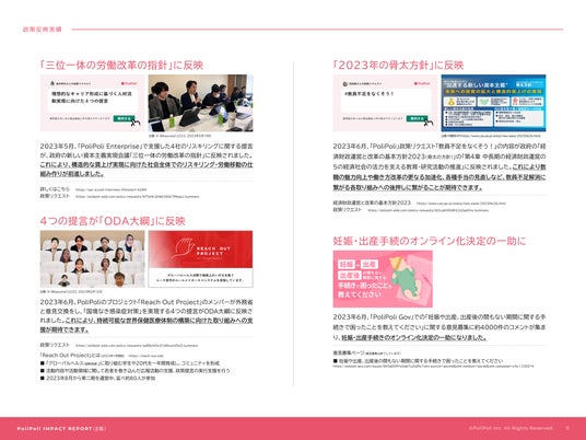 今回公開したレポートは、2023年度(2023年2月~2024年1月)に、PoliPoliが企画、開発、運営しているプラットフォームで実現した「政策共創」の事例が社会にどのような影響があったかを「インパクト」としてまとめたものです。