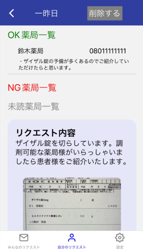 ●患者様対応、希望します!・医薬品不足SOSが発生した時点で、該当処方箋を撮影(個人情報を除く)。携帯端末上からそのまま画像添付し、近隣薬局宛てに一斉リクエスト送信することができます。
