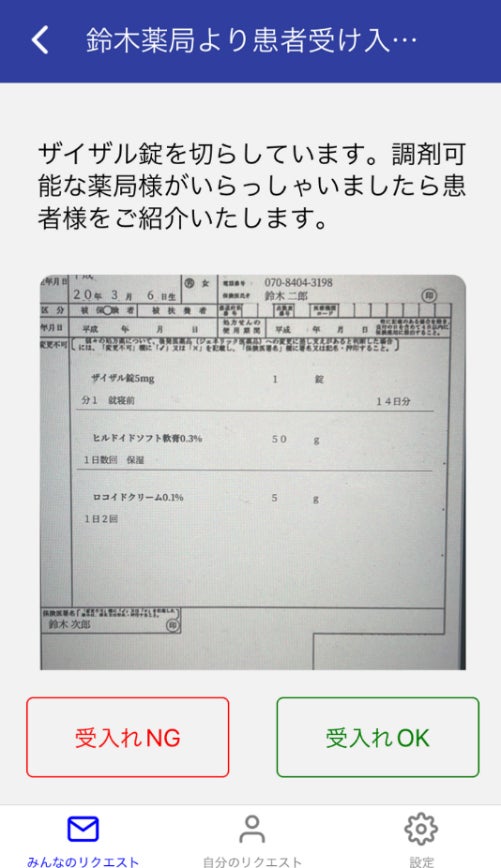 <処方箋画像を確認後、患者様受け入れ可否を端末画面から回答>【リクエストを受信した近隣薬局は】: