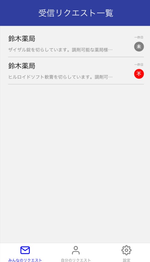 ●各リクエストごとに、自局の対応内容を送信・リクエスト受信した薬局側は、リクエスト元の薬局名や求められている医薬品名などを一覧確認することができます。
