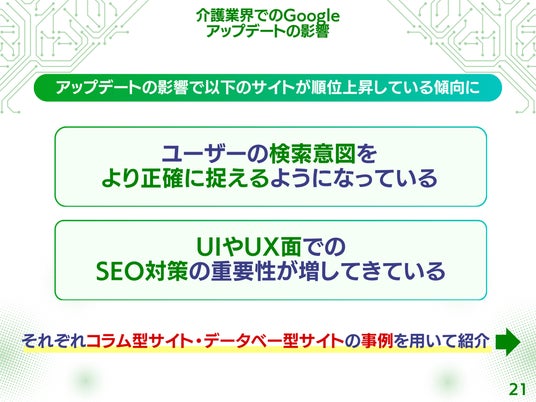 ・UI・UX面でのSEO対策の重要性が増してきているコラム型サイトとは、多くの記事を持つ情報サイトなどを指します。介護業界の場合、「老人ホーム 費用」「有料老人ホーム 種類」「介護 大変」などの検索キーワードに対応するコンテンツを作成したサイトを指します。データベース型サイトとは、多くのデータを持つECサイトや求人、不動産、グルメなどの情報掲載サイト、Q&Aサイトなどの一般ユーザーによって制作・生成されたUGCサイトを指します。介護業界の場合、様々な介護施設・老人ホームなどの情報を掲載したサイトがデータベース型サイトにあたります。「有料老人ホーム 東京」「介護施設 大阪」などの検索キーワードに対応するサイトです。本レポートでは、それぞれのサイトのGoogleアップデート後の変動について具体的な事例をもとに詳細に解説しています。