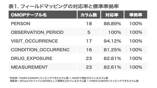まず、フィールドマッピングの対応率と標準準拠率は表1の通りとなりました。FHIR(R)からOMOPの80%以上のカラムがマッピングでき、その全てが標準規格に沿う結果を出すことができました。