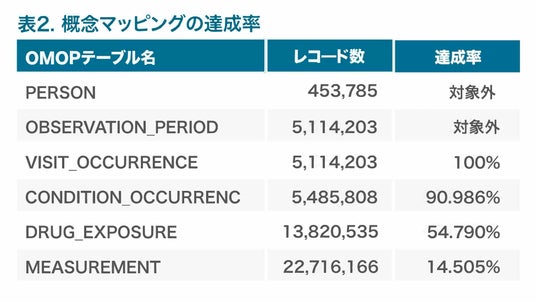 また、コンセプト変換の達成率としては表2の通りとなりました。本研究で利用したコードの変換表、および標準コードが付与されているデータの割合等も踏まえ以下の結果となっています。
