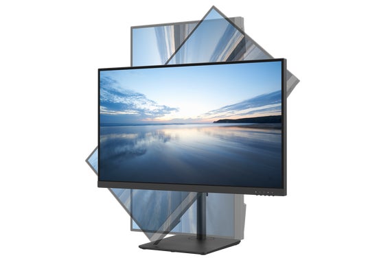 設置場所や使う人の姿勢に合わせて、画面の高さをちょうどいい位置へ調整(可動範囲145mm)ができます。左右どちらにも縦画面に回転することができ、内蔵のセンサーにより、画面の向きに合わせて画面表示が自動で回転する※1ため、面倒な設定や調整も不要です。