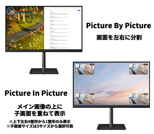 異なる2つのデバイスからの映像を同時に表示することができる便利な機能を搭載しています。PBP機能では、左右に分かれた映像を表示できます。PIP機能では、メイン画面の上にサブ画面を重ねて表示することができます。例えば、パソコンとゲームを接続し、攻略情報やネット動画を見ながらゲームをするといった使い方やパソコンとストリーミングデバイスを接続し、メイン画面で作業をしながら、サブ画面で動画を楽しむことが可能です。