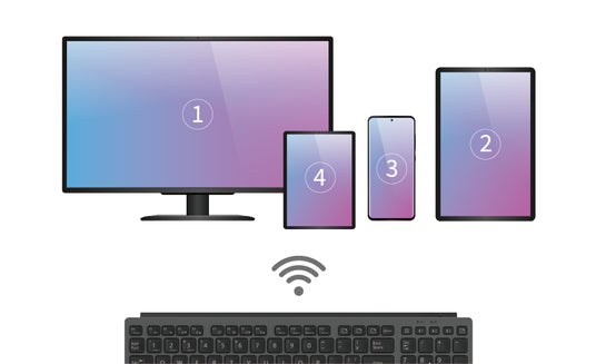 お手持ちのパソコン、タブレット、スマホに最大4台(USBレシーバーでの接続:1台、Bluetoothでの接続:3台)までペアリングすることが可能です。ワンタッチでデバイスを簡単に切り替えることができます。また、マルチOSに対応※3しています。
