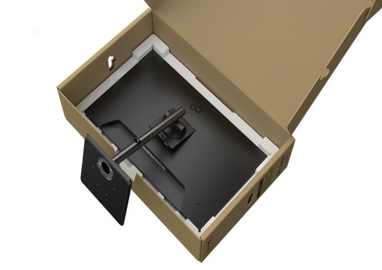 また、スタンドは位置を合わせて押し込むだけで、ネジなしで装着できる形状のため、かんたんに組み立てが可能です。加えて、新設計の梱包箱を採用することで箱に入れたまま組み立てができるため、広い場所での作業が不要となります。
