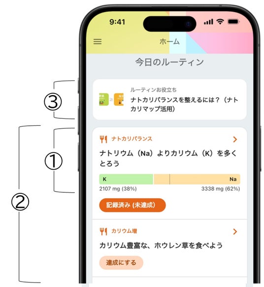 「ナトカリ」を継続するために推奨される食習慣を「今日のルーティン」として日替わりで表示します。ユーザーは「今日のルーティン」をチェックすることで、自然と「ナトカリ」に準じた食習慣が身につきます。