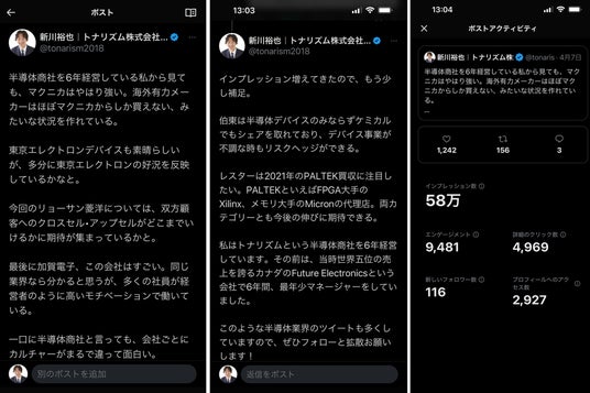 新川は今後もSNSを通じて、半導体業界の動向や商習慣、各社の位置づけなどに関する正確で分かりやすい情報をリアルタイムで発信し続けます。そして、フォロワーの皆さんとのエンゲージメントをさらに深め、半導体業界への理解や共感を醸成して参ります。