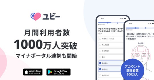 Ubie株式会社(本社:東京都中央区、共同代表取締役:阿部吉倫・久保恒太、以下「Ubie」)は、当社が2020年から運営する生活者向けサービス「ユビー」が、2024年の5月に月間利用者数1000万人を突破したことをお知らせします。全国の幅広い年齢層に利用され、「気になる症状が出た際に、必要な情報を調べられるサービス」という認知と活用が広まっています。さらに今後は、症状が出た時のみならず、受診・治療・健康時にもご利用いただける「パーソナル健康管理プラットフォーム」として、月間3000万人が利用する、新たな健康インフラを目指します。第一弾の取り組みとして本日よりマイナポータルとの本格連携を開始いたします。症状検索アプリ「ユビー」