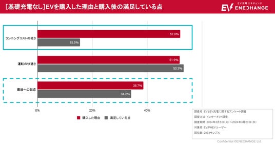 また、基礎充電がないEVユーザーのうち、52%が「ランニングコストの低さ」をEVの購入理由に選んでいるにもかかわらず、購入後の満足している点として上記を選んだ人は15.5%と著しく低下していることが明らかになりました。加えて、購入時点では「環境に配慮」を意識しているものの、購入後にEVを選択したことによって環境に配慮できているという実感を感じづらいこともわかりました。
