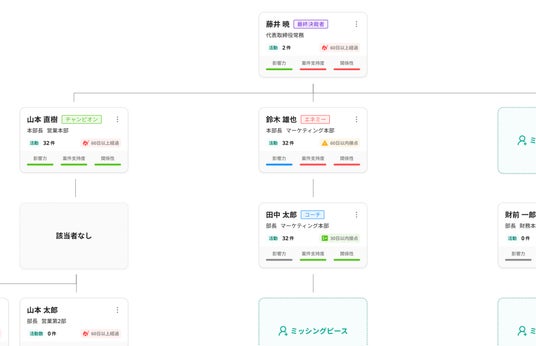 会うべき重要なキーマンの特定と直近の接点状況の可視化、ミッシングピース*の可視化を通じて更に高度な営業戦略策定に貢献します。