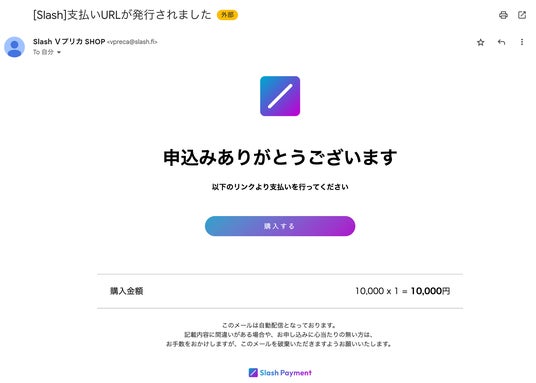 3 件名に「[Slash]支払いURLが発行されました」と記載されたメールが届きます。「購入する」ボタンをクリックするとSlash Paymentの決済画面に遷移します。