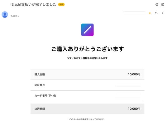 7 Slash Payment上で決済が完了すると、Vプリカの認証番号とカード番号が記載されたメールが先ほどのメールアドレス宛に届きます。
