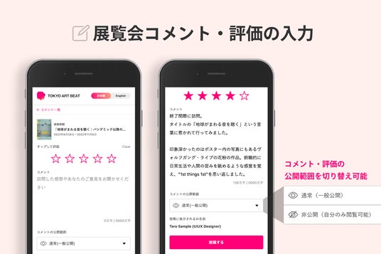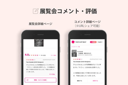 画面左:展覧会詳細画面におけるコメント・評価の見え方、画面右:コメント・評価の全文表示(コメント詳細ページはSNSやチャットツール等でシェア可能なURLです)