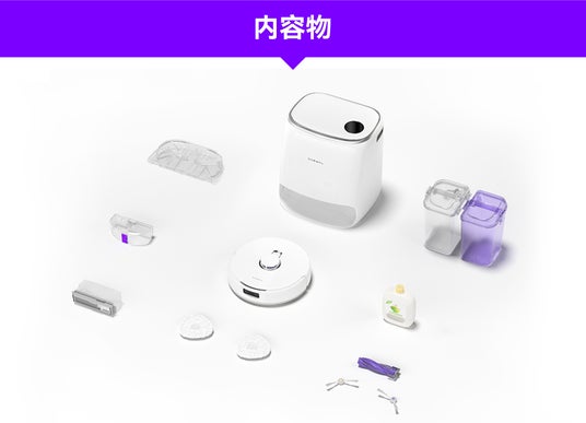 内容物:ベースステーション;ロボット本体;汚水タンク;清水タンク;モップクリーントレイ;絡まりゼロフローティングブラシ;サイドブラシ*2;ダストボックス*1;ダストバッグ*2;モップ*2;洗剤液*1