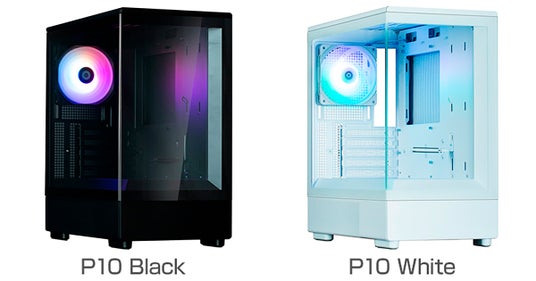 「P10」シリーズは、フロントと左サイドに強化ガラスパネルを採用した、ピラーレスデザインのミニタワー型PCケースです。リアに120mmサイズのアドレサブルRGBファンを標準装備するほか、右サイドパネルはメッシュ仕様になっており、エアフローを向上しています。