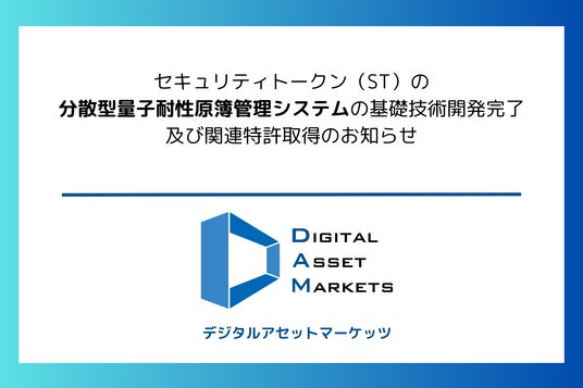 株式会社デジタルアセットマーケッツ(本社:東京都千代田区、代表取締役:西本一也、以下「デジタルアセットマーケッツ」)は、セキュリティトークン(以下、「ST」)の分散型量子耐性原簿管理システムにおける基礎技術開発が完了し、関連特許を取得したことをお知らせいたします。