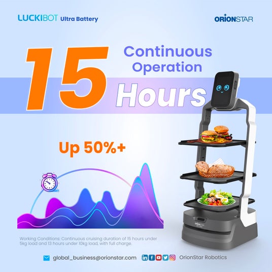 OrionStarは、ディフォルトモデルであるLuckiBot(ラッキーボット)に対し、特別に設計された大容量バッテリーソリューションを導入しました。新たに採用された高密度バッテリーにより、LuckiBotは標準巡回モードで最大15時間の連続稼働が可能となりました。この改良により、ロボットの単一稼働時間が大幅に延長され、ピーク時や終日の営業環境においても高効率で稼働し続けることが可能となり、頻繁な充電の必要がなくなります。