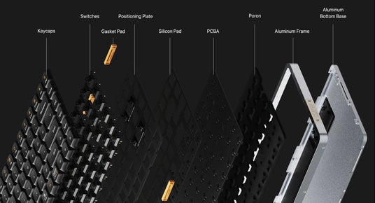 ポリカーボネイトのプレートに装着されたガスケットによって、TTC社と共同開発のキースイッチをキーボード本体から分離した構造になっています。また、Poronなどのフォームにより、タイピング時の振動をや反響音を減少させます。より静かで、より安定した、正確なタイピングを提供します。