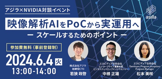 AI警備システム『AI Security asilla(以下asilla)』を提供する、株式会社アジラ(本社:東京都町田市、代表取締役CEO兼COO:尾上 剛)は、エヌビディア ジャパンとともに、2024年6月4日(火)にオンライン対談イベント「映像解析AIをPoCから実運用へ~スケールするためのポイント~」を開催いたします。