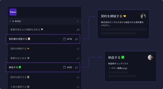 Tooonは業務委託取引に特化したオールインワンツールとして情報やワークフローの整理・業務の効率化を実現します。