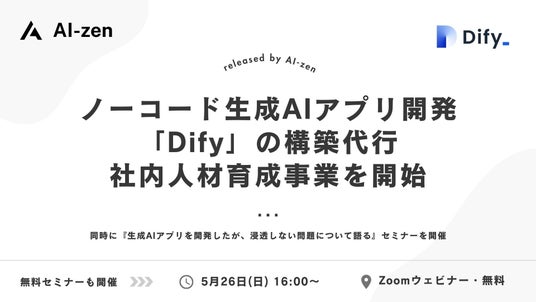 AI-zen株式会社、生成AIアプリ開発プラットフォーム「Dify」の構築代行・社内人材育成事業を開始。同時に無料セミナーも5月26日14時から開催。