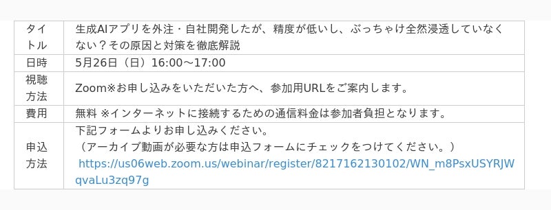 さらに、生成AIアプリ開発の現状と課題を探る無料セミナー「生成AIアプリを外注・自社開発したが、精度が低いし、ぶっちゃけ全然浸透していなくない?その原因と対策を徹底解説」を開催いたします。本セミナーでは、生成AI開発の現状、活用が浸透しない原因、解決策、そしてDifyの紹介を行います。