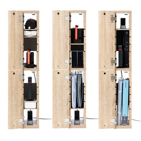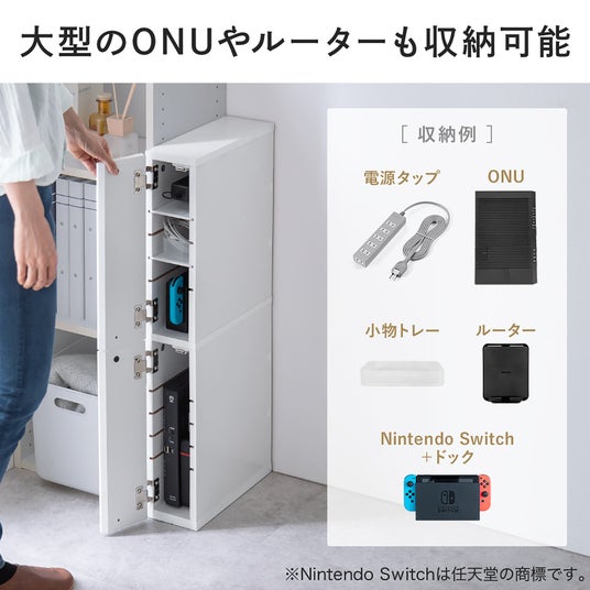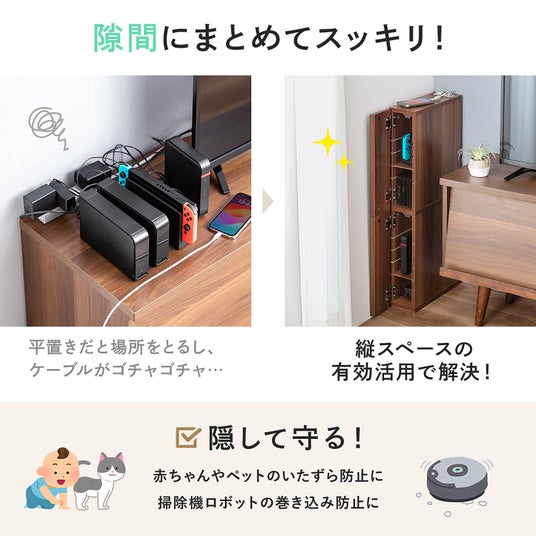 わずかなスペースも有効活用!当製品は幅12cmの超スリム設計で、ケーブルや電源タップ、Wi-Fiルーターなどを綺麗に収納できます。