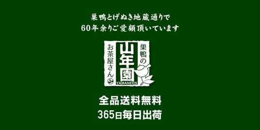 巣鴨のお茶屋さん山年園(読み方:やまねえん)は、巣鴨とげぬき地蔵通り門前仲見世にあり、60年余りの間、参拝のお客様にご愛顧頂いております。巣鴨でおばあちゃんの味覚で鍛えられ、選びぬかれた「こだわりのお茶」「健康茶・健康食品」「おやつ・お茶うけ」を販売しております。ゆったりとした巣鴨の雰囲気、下町の良さを添えて、皆様のお茶の間に届けさせていただければ幸いです。