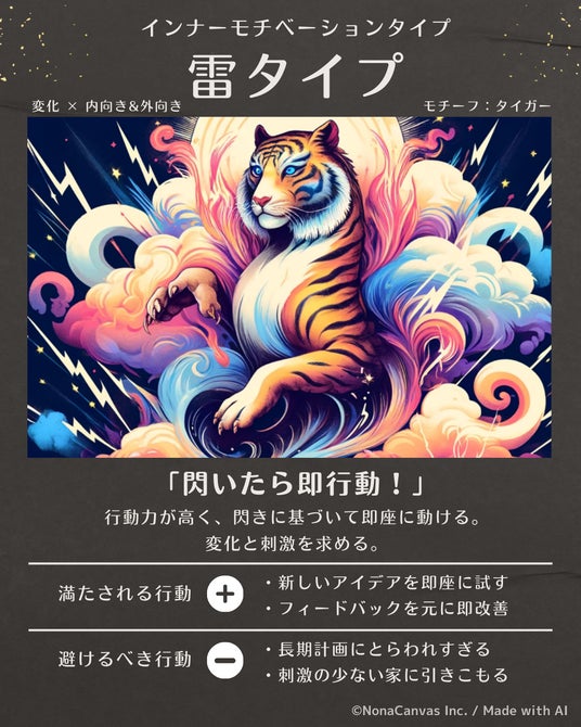 雷タイプ(モチーフ:タイガー)は「閃いたら即行動!」が欲求の源泉。このタイプは、直感やひらめきを大切にし、それに基づいてスピーディに行動することで充実感を得ます。リアルタイムで状況が変わり、臨機応変な対応を求められる場面で最もイキイキしますが、反対に、変化が少ない場所、フィードバックを感じにくい環境にいると、エネルギーが損なわれてしまうリスクがあります。