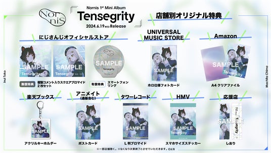 歌唱力に定評のある戌亥とこ、町田ちまの2名による女性ボーカルユニットNornis(ノルニス)より、2024年6月19日(水)発売、現在予約受付中のNornis 1st Mini Album『Tensegrity(テンセグリティ)』の店舗別オリジナル購入特典画像を公開いたします。