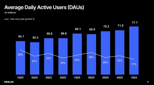Robloxは最新のデータで、日間アクティブユーザー数が7770万人(前年同期比で17%成長)、ユーザーの総エンゲージメント時間が167億時間(同23%成長)という非常に豊かなユーザー基盤を持つプラットフォームです。