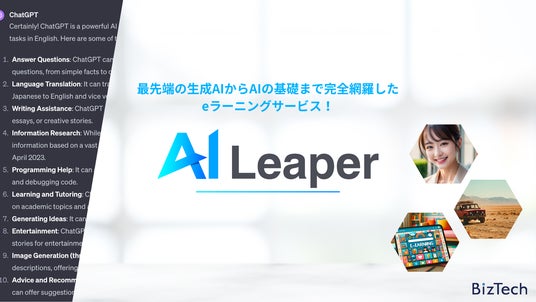 AI開発のコンシェルジュサービス「AI Market」やプロンプトマーケットプレイス「Prompt Plus」を手掛けるBizTech株式会社(本社:東京都豊島区 代表取締役: 森下佳宏、 以下「当社」)は、2024年5月23日(木)、株式会社XAI(本社:東京都渋谷区 代表取締役: 八木谷 佑太)と共同で、最先端の生成AIからAIの基礎まで完全網羅した法人向けeラーニングサービス「AI Leaper」の提供を開始しました。