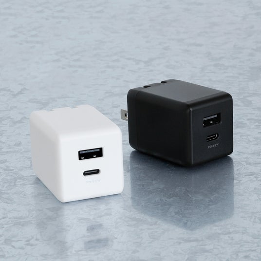 本製品は最大PD45W出力が可能なAC充電器です。GaN採用で小型化、高出力、発熱抑制を実現しています。USB Type-Cポートを1基、USB Type-Aポートを1基搭載しているため、接続機器を最大2台同時に充電できます。Type-CポートはPD-PPSにも対応しており、最大45Wでの充電が、Type-Aポートは最大18Wでの『かしこく充電』が可能です。USB Type-CポートではPD対応のノートPCも充電できます。「過電流保護」「過電圧保護」「短絡(ショート)保護」の各種保護機能を搭載したPSE適合製品なので、安心・安全にご利用いただけます。