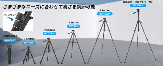 【軽量で簡単に調整可能】写真用三脚は 4 つのセクションに分かれており、わずか数秒で 18 インチから 60 インチまで自由に調整できるため、さまざまな撮影環境の要件を満たすことができます。テーブル三脚、旅行用三脚、ビデオ用三脚として使用できます。さらに、三脚は 19 インチ未満に折りたたむことができ、重さはわずか 2.75 ポンドなので、屋外でのクリエイティブな活動に便利です。