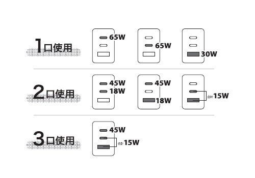 3台同時充電では、USB-C1は最大45W、USB-C2・USB-A(合計)は最大15Wでの出力が可能です。