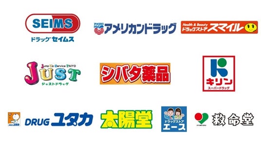富士薬品グループのドラッグストア:「ドラッグセイムス」「アメリカンドラッグ」「ドラッグストアスマイル」「ジャストドラッグ」「シバタ薬品」「スーパードラッグキリン」「ドラッグユタカ」「くすりの太陽堂」「ドラッグストアエース」「くすりの救命堂」全 1,271 店舗(2024年3月末時点)