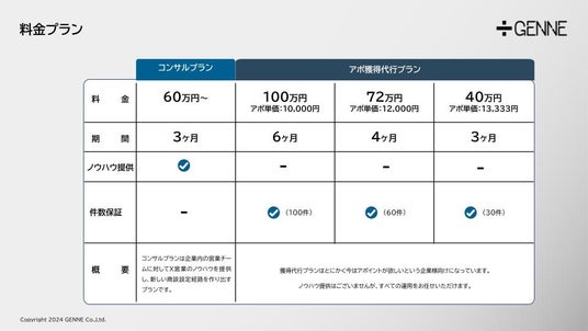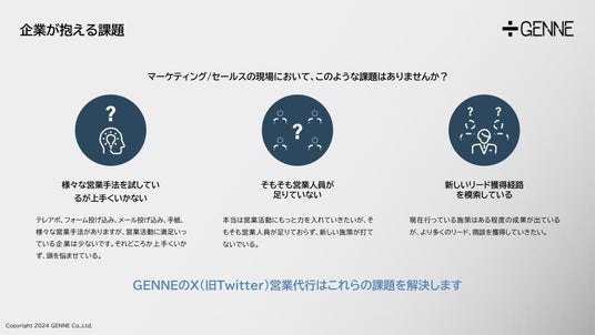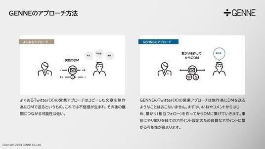 元々何のコネも繋がりもなく創業したGENNEが自社で編み出した営業手法をサービス化したものです。Xを活用し企業の代表、役員、事業部長など所謂企業のキーマンのアポイントを取得します。従来のただDMをばら撒くだけのよくあるSNSアプローチではなく、1件1件コミュニケーションを取りつつアポイントまで繋げていく手法になります。