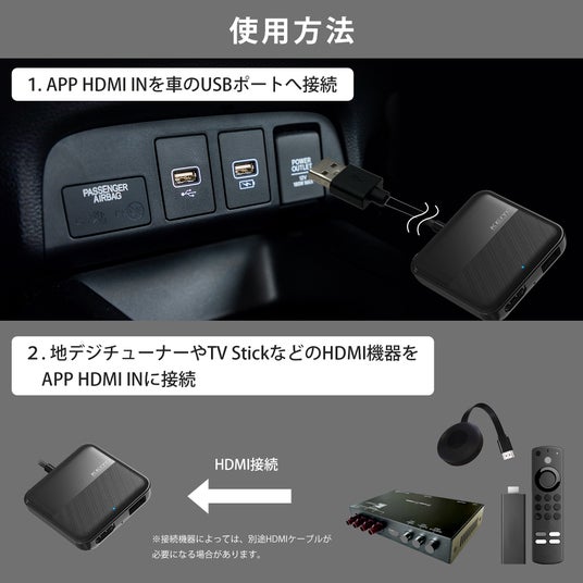 HDMI入力の無い車両でも、車両のデータ通信用USBポートに本器を繋ぎ、Fire TV Stick、DVDプレーヤー、地デジチューナー、ゲーム機のHDMI出力を本器に繋げて楽しむことができます。