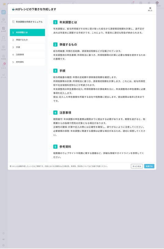 これらの課題を解決するため、「トースターチーム」では業務マニュアルのタイトルを入力するだけで、数秒でステップ形式の構成と見出し、マニュアル本文を自動で作成する「AIマニュアル自動作成機能」を2023年5月に提供し、マニュアル作成の自動化および作成にかかる時間とコストの削減を実現しました。店舗の運営マニュアルや製造現場の管理マニュアル、総務や経理、財務、人事、労務などのバックオフィス業務に関するマニュアルなど、さまざまな部門で活用されています。