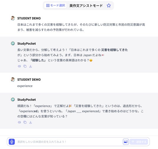 探究学習モードから派生して最近リリースされた「英作文アシストモード」は、英作文の支援に特化した機能です。問題の全体像を分解し、知っている単語や表現を1つ1つ確認しながら、英作文の勉強をサポートします。