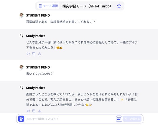 例えば、「読書感想文を書いて」と依頼した場合、「どのようなシーンが印象的でしたか?」といった応答を行います。また、数学の宿題を送った場合、「これを解くために必要な公式は覚えていますか?」といった応答を行います。