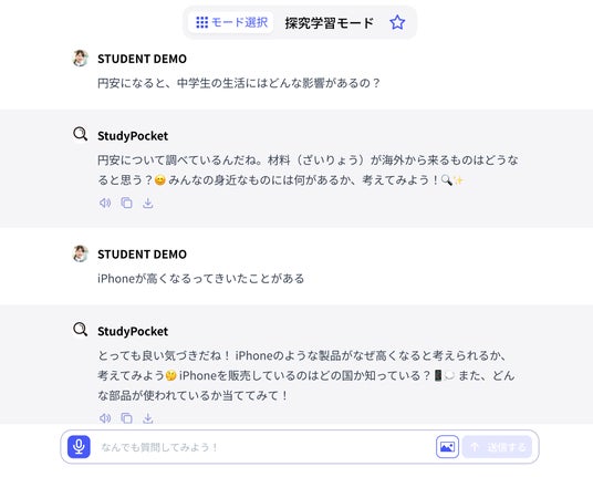 スタディポケットは、生徒が学習内容を相談した際に、AIが直接的な答えを教えるのではなく、生徒が主体的に考える力を育むための「探究学習モード」を提供しています。